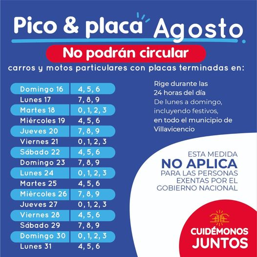 Este es el pico y Placa para Villavicencio Meta, Colombia año 2023.